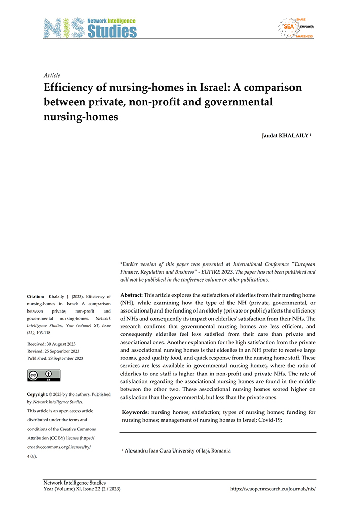 - Citation: Khalaily J. (2023). Efficiency of nursing-homes in Israel: A comparison between private, non-profit and governmental nursing-homes. Network Intelligence Studies, Year (volume) XI, Issue (22), 103-118.