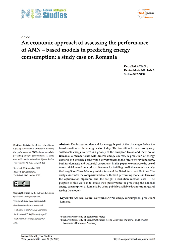 - Citation: : Bălăcian D., Melian D. M., Stancu S. (2023). An economic approach of assessing the performance of ANN – based models in predicting energy comsumption: a study case on Romania. Network Intelligence Studies, Year (volume) XI, Issue (22), 119-135.