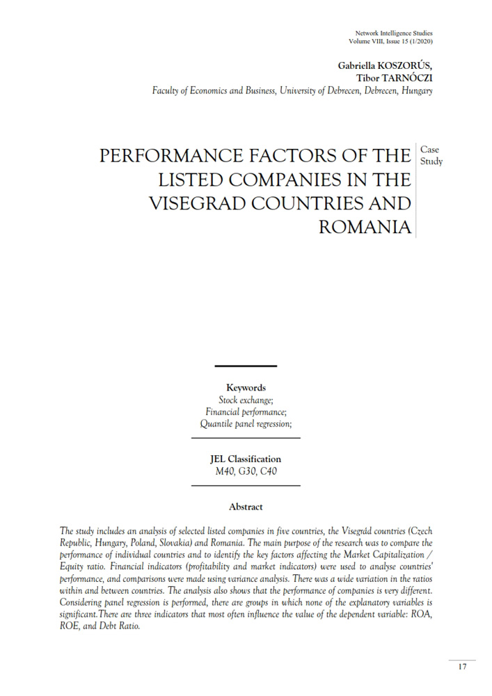 The study includes an analysis of selected listed companies in five countries, the Visegrád countries (Czech Republic, Hungary, Poland, Slovakia) and Romania. The main purpose of the research was to compare the performance of individual countries and to identify the key factors affecting the Market Capitalization / Equity ratio. Financial indicators (profitability and market indicators) were used to analyse countries' performance, and comparisons were made using variance analysis. There was a wide variation in the ratios within and between countries. The analysis also shows that the performance of companies is very different. Considering panel regression is performed, there are groups in which none of the explanatory variables is significant.There are three indicators that most often influence the value of the dependent variable: ROA, ROE, and Debt Ratio.