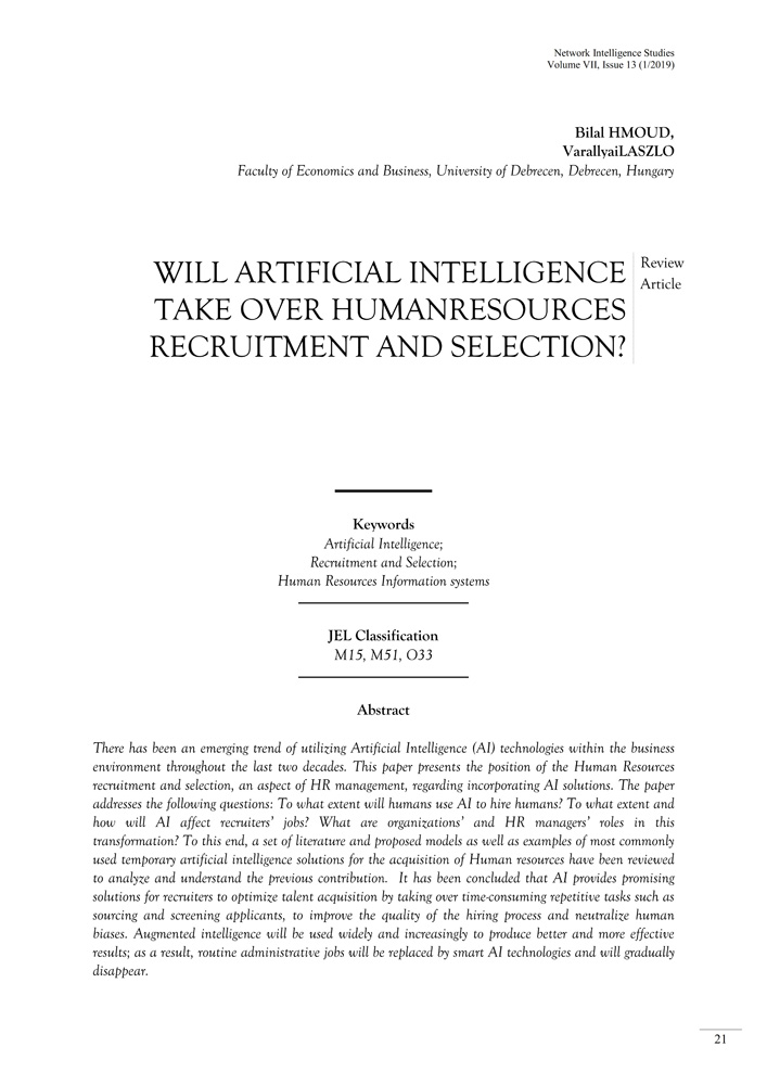 - Keywords: Artificial Intelligence; Recruitment and Selection; Human Resources Information systems