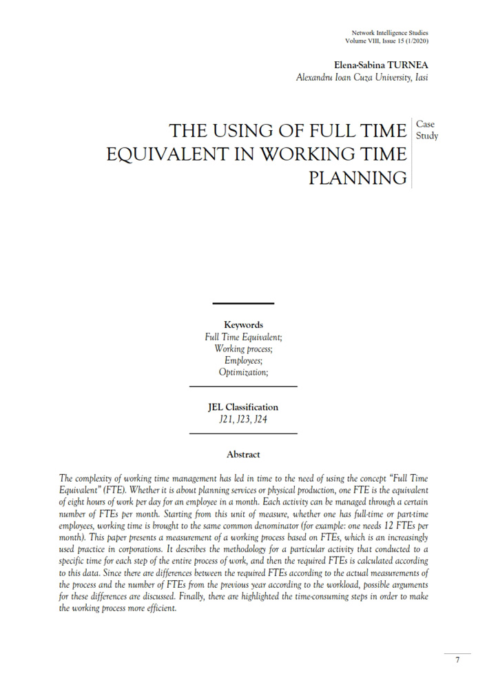 The complexity of working time management has led in time to the need of using the concept “Full Time Equivalent” (FTE). Whether it is about planning services or physical production, one FTE is the equivalent of eight hours of work per day for an employee in a month. Each activity can be managed through a certain number of FTEs per month. Starting from this unit of measure, whether one has full-time or part-time employees, working time is brought to the same common denominator (for example: one needs 12 FTEs per month). This paper presents a measurement of a working process based on FTEs, which is an increasingly used practice in corporations. It describes the methodology for a particular activity that conducted to a specific time for each step of the entire process of work, and then the required FTEs is calculated according to this data. Since there are differences between the required FTEs according to the actual measurements of the process and the number of FTEs from the previous year according to the workload, possible arguments for these differences are discussed. Finally, there are highlighted the time-consuming steps in order to make the working process more efficient.