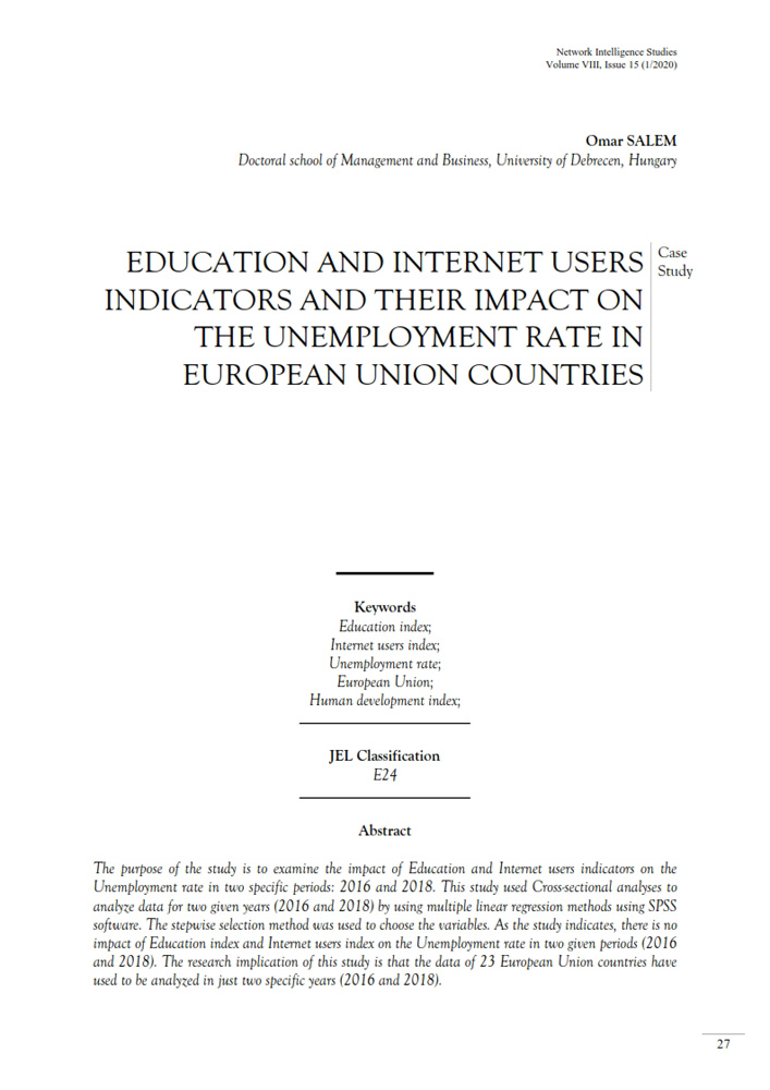 - Keywords: Education index; Internet users index; Unemployment rate; European Union; Human development index;