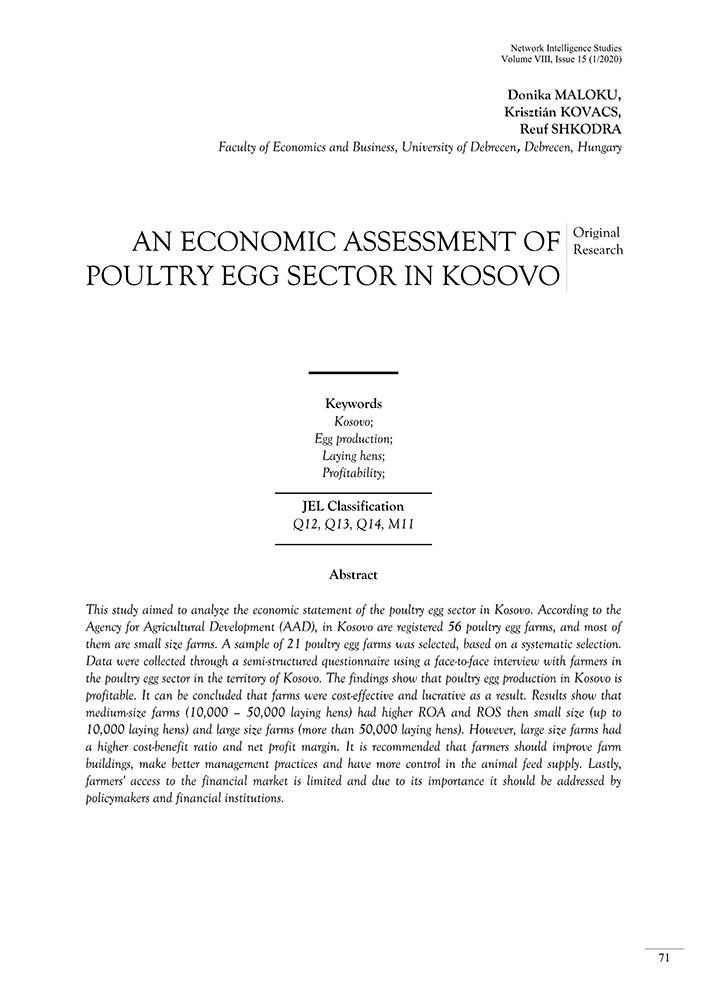 This study aimed to analyze the economic statement of the poultry egg sector in Kosovo. According to the Agency for Agricultural Development (AAD), in Kosovo are registered 56 poultry egg farms, and most of them are small size farms. A sample of 21 poultry egg farms was selected, based on a systematic selection. Data were collected through a semi-structured questionnaire using a face-to-face interview with farmers in the poultry egg sector in the territory of Kosovo. The findings show that poultry egg production in Kosovo is profitable. It can be concluded that farms were cost-effective and lucrative as a result. Results show that medium-size farms (10,000 – 50,000 laying hens) had higher ROA and ROS then small size (up to 10,000 laying hens) and large size farms (more than 50,000 laying hens). However, large size farms had a higher cost-benefit ratio and net profit margin. It is recommended that farmers should improve farm buildings, make better management practices and have more control in the animal feed supply. Lastly, farmers' access to the financial market is limited and due to its importance it should be addressed by policymakers and financial institutions.