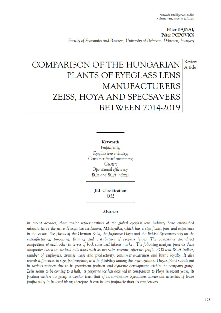 In recent decades, three major representatives of the global eyeglass lens industry have established subsidiaries in the same Hungarian settlement, Mátészalka, which has a significant past and experience in the sector. The plants of the German Zeiss, the Japanese Hoya and the British Specsavers rely on the manufacturing, processing, framing and distribution of eyeglass lenses. The companies are direct competitors of each other in terms of both sales and labour market. The following analysis presents these companies based on various indicators such as net sales revenue, after-tax profit, ROS and ROA indices, number of employees, average wage and productivity, consumer awareness and brand loyalty. It also reveals differences in size, performance, and profitability among the organizations. Hoya's plant stands out in various respects due to its prominent position and dynamic development within the company group. Zeiss seems to be coming to a halt, its performance has declined in comparison to Hoya in recent years, its position within the group is weaker than that of its competitor. Specsavers carries out activities of lower profitability in its local plant; therefore, it can be less profitable than its competitors.