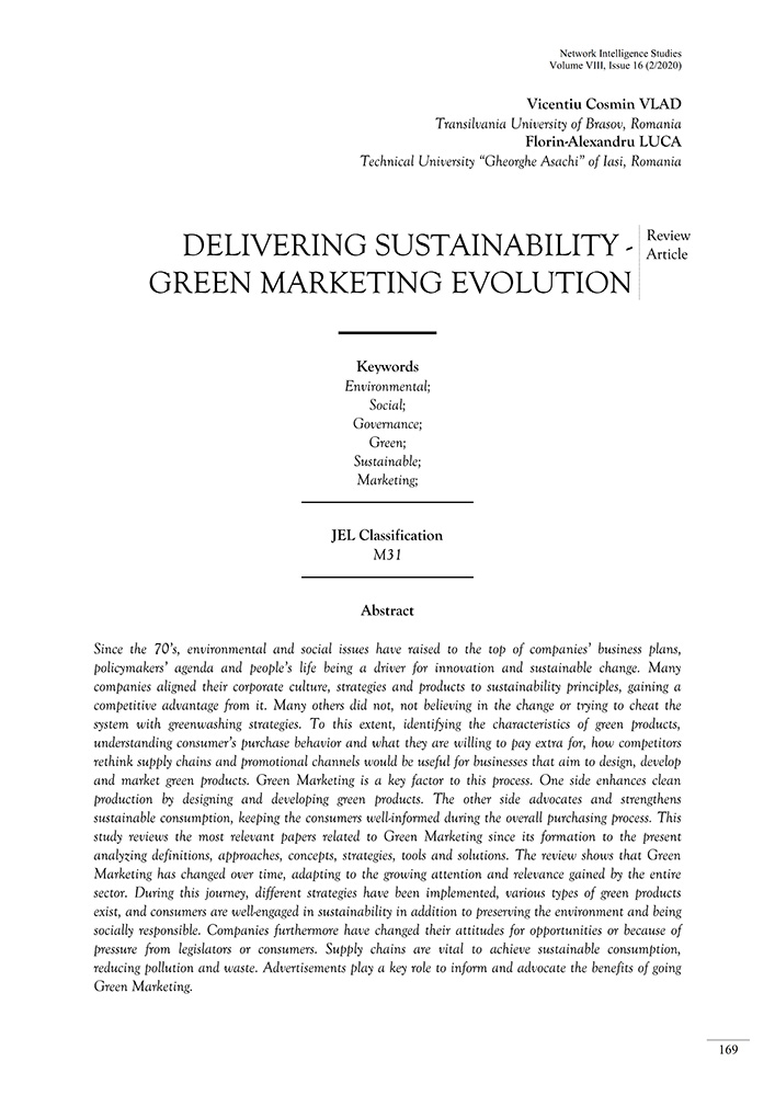Since the 70’s, environmental and social issues have raised to the top of companies’ business plans, policymakers’ agenda and people’s life being a driver for innovation and sustainable change. Many companies aligned their corporate culture, strategies and products to sustainability principles, gaining a competitive advantage from it. Many others did not, not believing in the change or trying to cheat the system with greenwashing strategies. To this extent, identifying the characteristics of green products, understanding consumer’s purchase behavior and what they are willing to pay extra for, how competitors rethink supply chains and promotional channels would be useful for businesses that aim to design, develop and market green products. Green Marketing is a key factor to this process. One side enhances clean production by designing and developing green products. The other side advocates and strengthens sustainable consumption, keeping the consumers well-informed during the overall purchasing process. This study reviews the most relevant papers related to Green Marketing since its formation to the present analyzing definitions, approaches, concepts, strategies, tools and solutions. The review shows that Green Marketing has changed over time, adapting to the growing attention and relevance gained by the entire sector. During this journey, different strategies have been implemented, various types of green products exist, and consumers are well-engaged in sustainability in addition to preserving the environment and being socially responsible. Companies furthermore have changed their attitudes for opportunities or because of pressure from legislators or consumers. Supply chains are vital to achieve sustainable consumption, reducing pollution and waste. Advertisements play a key role to inform and advocate the benefits of going Green Marketing.